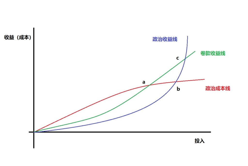 红线为成本线,也就是政治代价,具体说,是对手方的报复和己方的惩罚的总和,注意,它需要被触发才发挥作用,比如被逮捕。绿线为卷款收益线,也就是诈骗的收益,具体说,是从组织卷走的资金总和。蓝线为事业收益线,也就是耕耘的收益,具体说,是事业本身赢得的名和利的总和。